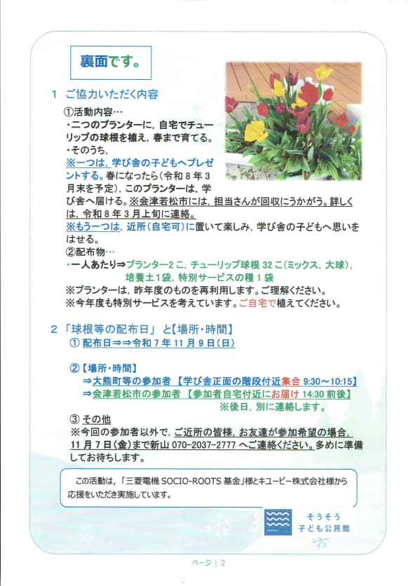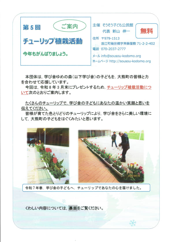 第5回「チューリップ植栽活動」のご案内 2025年10月20日 最終更新日時 : 2025年10月20日 長井礼子 「第5回チューリップ植栽活動ご案内」はこちらからダウンロード お問合せ先…そうそう子ども公民館 代表 新山 伸一 電話070-2037-2777