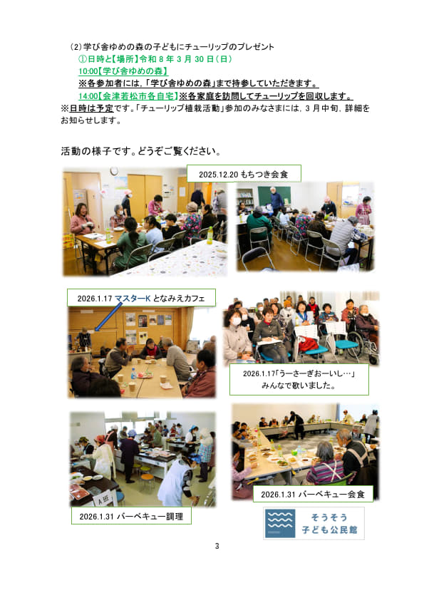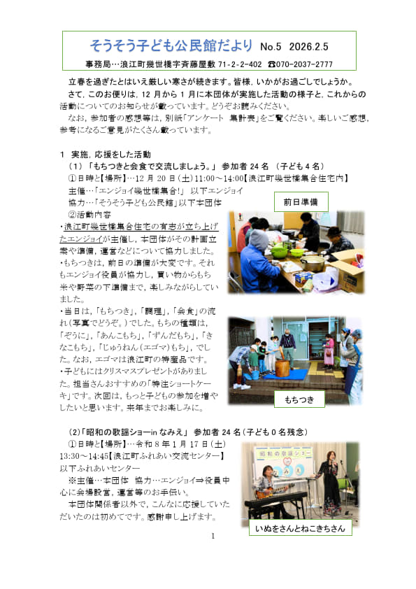 さて,このお便りは,12月から1月に本団体が実施した活動の様子と,これからの活動についてのお知らせが載っています。どうぞお読みください。